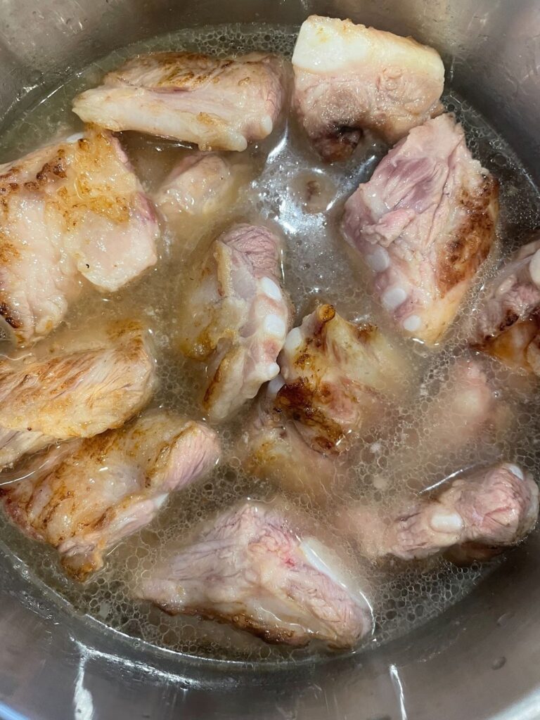 • 焼いてから圧力鍋で下茹で → 圧力鍋で調理